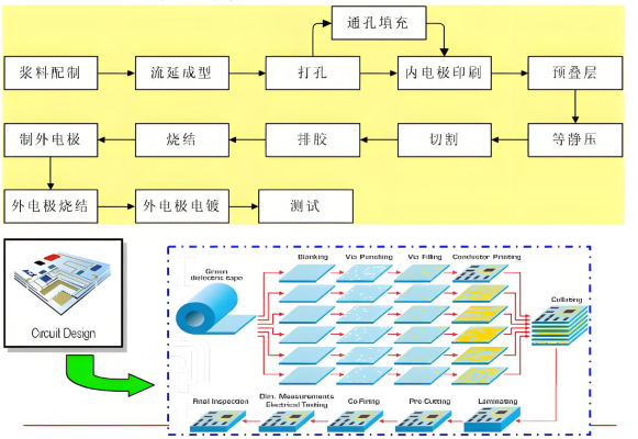 YdinprosessiLTCCTeknologia on seuraava: Ensinnäkin, keraaminen jauhe, lasijauhe ja orgaaniset sideaineet sekoitetaan ja prosessoidaan sitten vihreisiin keraamisiin nauhoihin, joissa on tarkka paksuus ja tiheä rakenne nauhan valun, kuivauksen ja muiden prosessien avulla. Myöhemmin vaadittavat piirikuviot valmistetaan vihreissä keraamisissa nauhoissa tekniikoilla, kuten laserporaus, mikroreiän injektointi ja tarkkuusjohdinpastatulostus. Seuraavaksi useita jalostettuja vihreitä keraamisia nauhoja laminoidaan ja integroidaan, ja sintrataan matalan lämpötilan ympäristössä alle 900 ° C. Lopuksi voidaan tuottaa sirulaitteita; Se voi myös upottaa useita passiivisia komponentteja yhden kolmiulotteisen keraamisen monikerroksen piirisubstraatin muodostamiseksi; Lisäksi ICS ja aktiiviset laitteet voidaan asentaa sen pinnalle passiivisten/aktiivisten integroidujen funktionaalisten moduulien luomiseksi. Tämä tekniikka voi edelleen edistää piireiden pienentämistä ja suurta tiivistymistä, ja se on erityisen sopiva komponenttien valmistukseen korkeataajuisella viestintäkentällä.