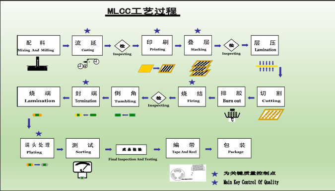 MLCC(monikerroksinen keraaminen kondensaattori) on laajalti käytetty kondensaattorin tyyppi. Sen rakenne muodostetaan lomittamalla ja pinoamalla keraamisia dielektrisiä kalvoja, jotka on painettu sisäisillä elektrodeilla, sintraamalla niitä korkeassa lämpötilassa keraamisen lohkon muodostamiseksi ja sitten metallikerrosten sulkemiseksi molemmissa päissä. Se koostuu kolmesta osasta: keraamiset dielektriset, metalliset sisäiset elektrodit ja metalliset ulkoiset elektrodit.MLCCon edut pienestä tilavuudesta, suuresta kapasitanssista, alhaisesta menetyksestä korkeilla taajuuksilla, soveltuvuus massatuotantoon, alhainen hinta ja hyvä vakaus. Se täyttää kevyen, ohuen, lyhyen ja pienen tietotoimintotuotteen vaatimukset ja on tärkeä komponentti nykyaikaisissa elektronisissa tuotteissa. Mikä on valmistusprosessi MLCC?